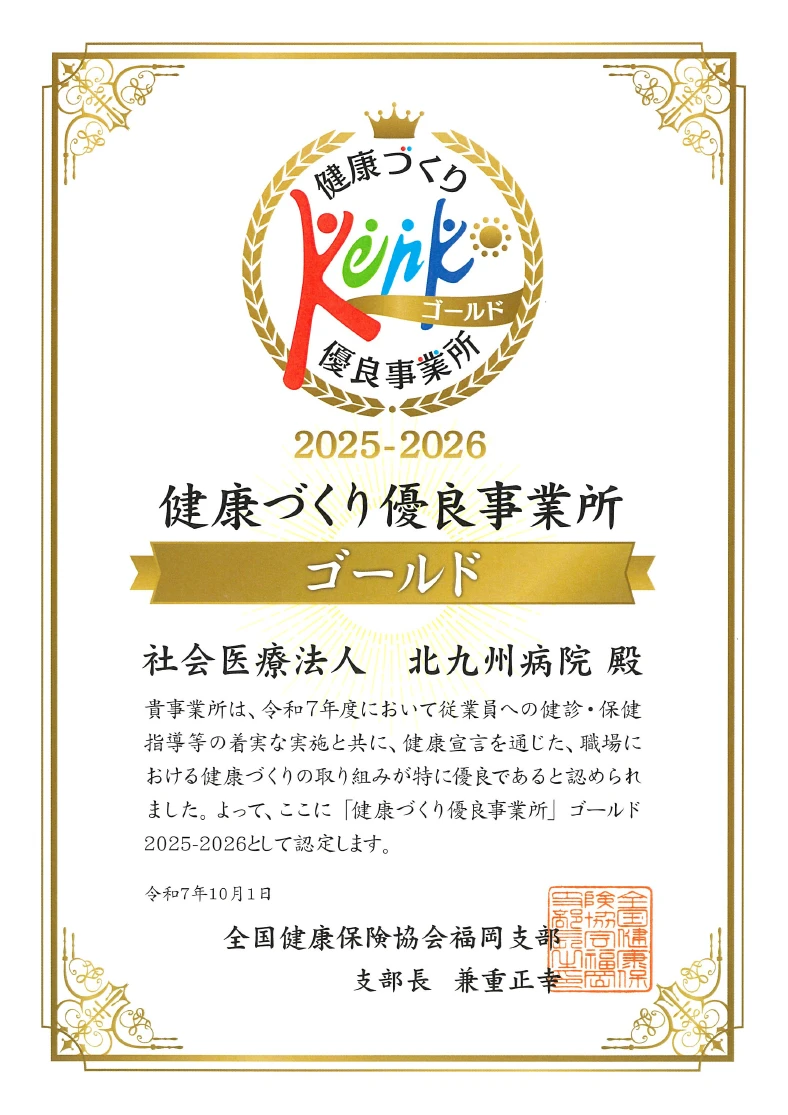 北九州病院は、職員に向けた健康づくりの取り組みが特に優良であると認められ、『健康づくり優良事業所ゴールド』に認定されました。